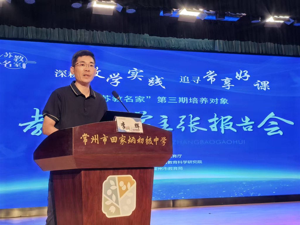 为深入贯彻“苏教名家”培养工程宗旨,落实立德树人根本任务,充分发挥名师示范引领作用,10月10日,“苏教名家”培养工程第三期培养对象教育教学主张报告会在常州市田家炳初级中学隆重举行。省教育厅教师工作处副处长李辉、省教育学会名誉会长杨九俊教授、省教育科学研究院何锋博士、苏州科技大学博士生导师金生鈜教授、市教育局副局长俞群祥、市教科院院长韩志祥、市教育局人事与教师工作处处长潘莉等出席活动。 本次活动聚焦教育教学创新实践与思想碰撞,通过上午开幕式、教育教学主张报告与专家点评,以及下午课堂教学展示、沙龙研讨与团队汇报,搭建起专业交流与成长的高端平台,彰显了苏派教育的深厚底蕴与常州教育的奋进姿态。本次活动,还通过网络,全程在线直播。 锚定航向 以育人本真明晰教育初心