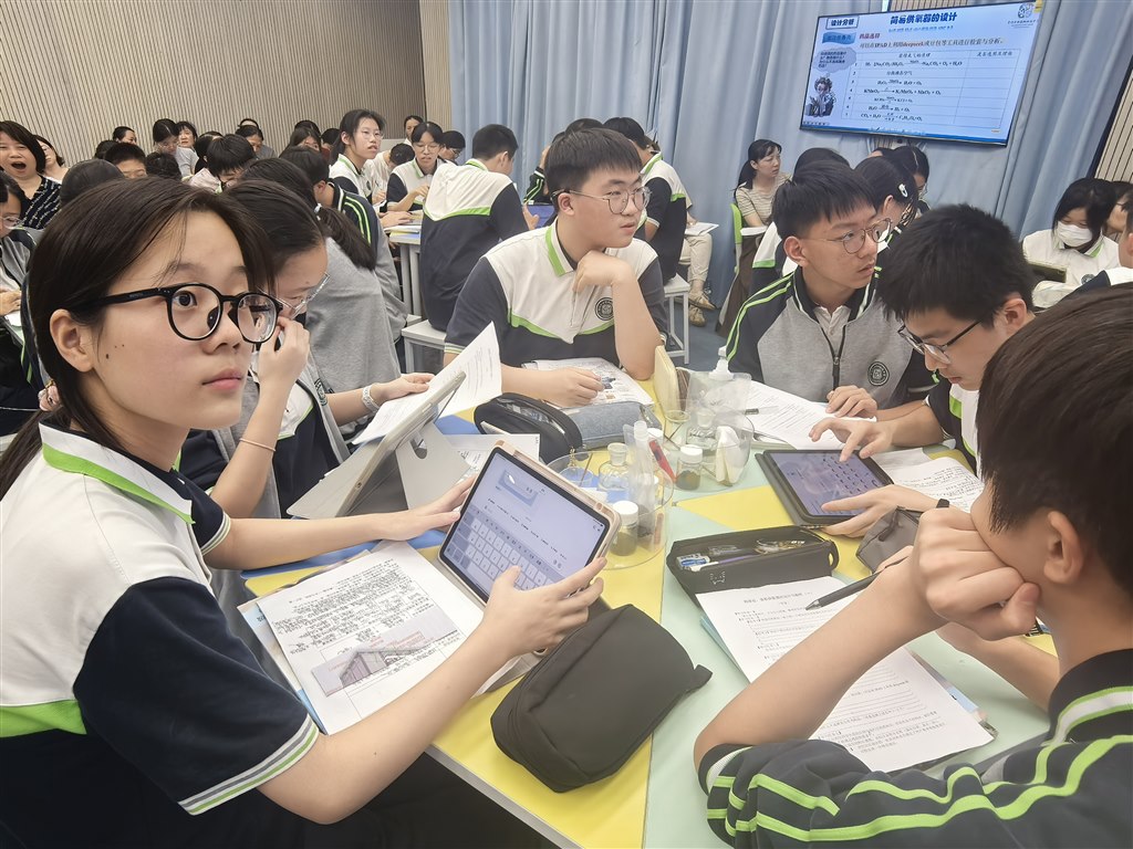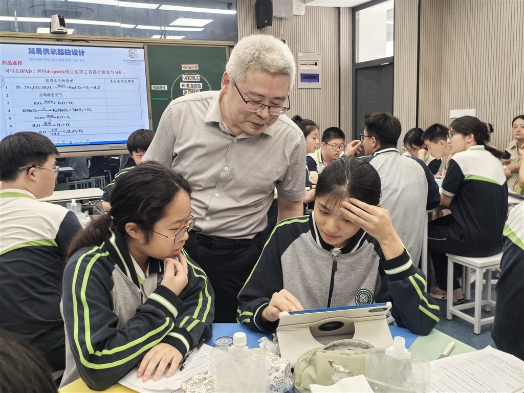 实践赋能 以课堂展示诠释育人理念 下午课堂教学实践与沙龙研讨活动常州市实验小学、在常州市田家炳初级中学、江苏省前黄高级中学三个分会场举行。 李军老师执教的九年级化学《初体验:简易供氧器的设计与制作(一)》,以项目式学习和跨学科引导为思路。在引导学生分组设计、动手制作供氧器的过程中,他不仅带领学生了解设计原则、需求分析等流程,还在药品选择与供氧器设计的关键环节,引导学生运用DeepSeek、豆包等 AI 工具查询资料,为方案论证和细节优化提供高效信息支持。这一教学方式,既帮助学生掌握了化学知识,提升了工程实践与团队协作能力,也让学生切实体会到化学服务生活的价值,践行了其“小学校 大文化”中“以文化滋养素养”的主张。