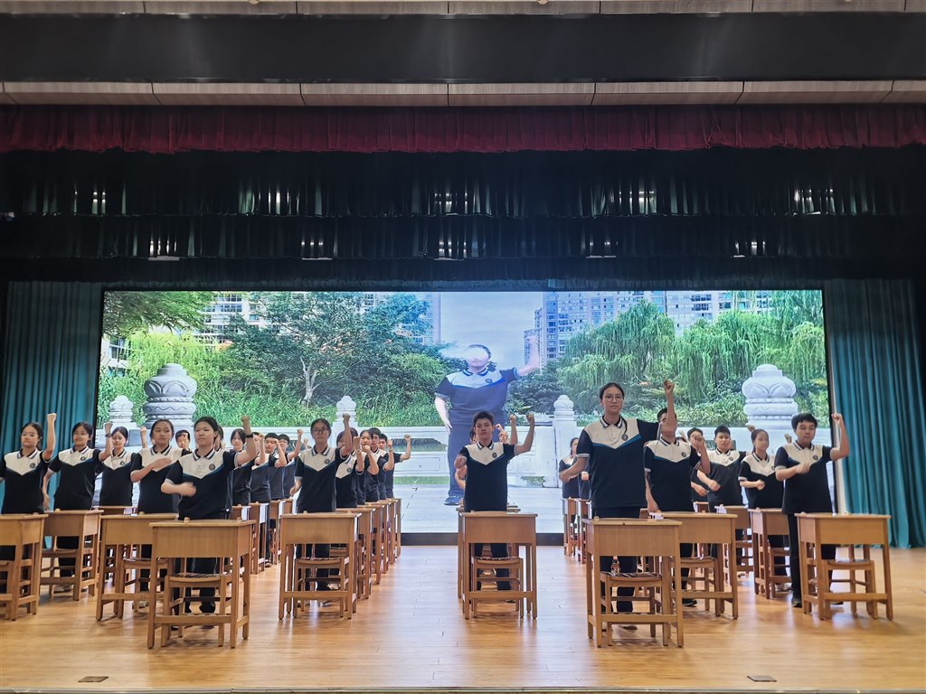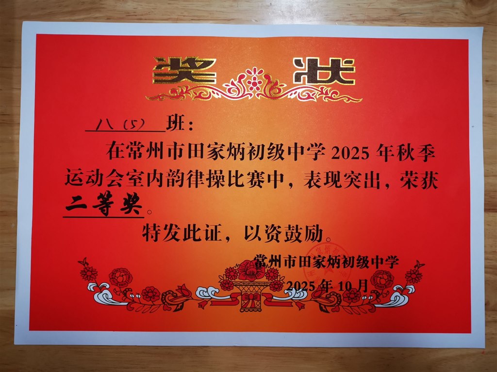 当课桌不再只是学习的阵地,当青春在韵律中肆意挥洒,一场别开生面的室内韵律操大赛在常州市田家炳初级中学的舞台上活力上演。 2025年秋季,该校运动会系列活动之室内韵律操评比重磅来袭,各班级轮番登场,以课桌为景,以动作传情。其中,八年级(5)班的表现尤为亮眼,最终斩获二等奖。 比赛现场,八(5)班的同学们身着统一校服,在木质课桌间划出一道道整齐的弧线。抬手时如振翅雏鹰充满力量,舒展处似青竹拔节尽展柔韧,每一个动作都精准踩在韵律节点上。他们背后的大屏同步呈现校园景致,虚实交融间,青春的朝气与校园的灵动完美契合。 这份荣誉背后,是他们利用校内的课余时间、家中的休息时间反复打磨的坚持,是课间互相纠正动作的较真,更是整个班级拧成一股绳的凝聚力。当奖状上“二等奖”的字样闪耀,每一位同学的笑靥都在诉说:这不仅是一场操的评比,更是青春风采的盛大绽放。