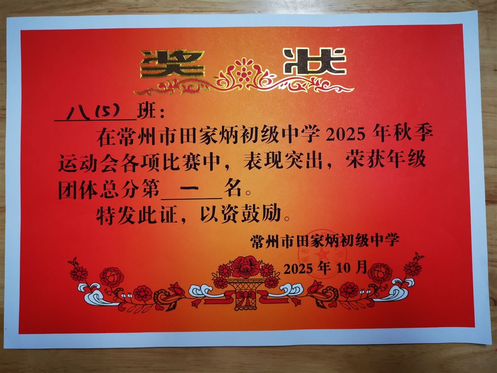 在常州市田家炳初级中学2025年秋季运动会上,八(5)班凭借全体同学的拼搏与协作,斩获年级团体总分第一名,书写了属于他们的运动荣光。 赛场上,五班健儿们奋勇争先:短跑选手如离弦之箭冲刺终点,长跑队员用毅力诠释坚持,田赛选手在跳跃、投掷中挑战自我。领奖台上,佩戴奖牌的同学笑容灿烂,每一块奖牌都是汗水的结晶。从入场式的创意展演,到各项赛事的全力以赴,五班同学将“燃青春赛场,铸民族脊梁”的信念融入每一次奔跑、每一次呐喊。 这份团体总分第一的荣誉,是个人拼搏的叠加,更是班级凝聚力的最好证明。八(5)班以运动为笔,以团结为墨,在校园运动史上绘就了一幅拼搏向上的青春画卷。