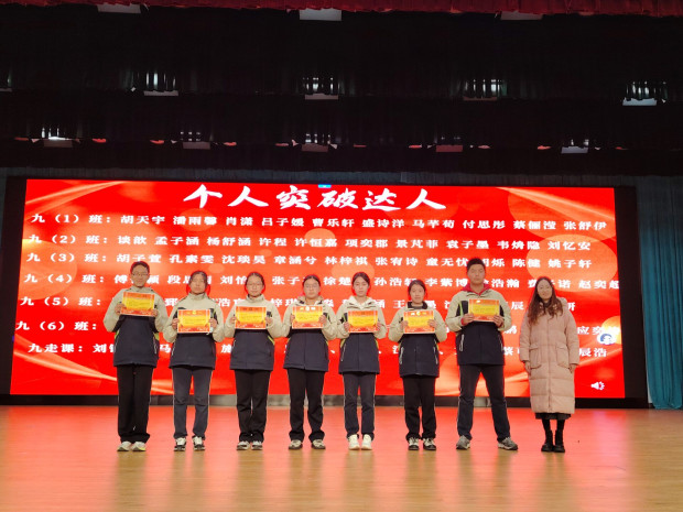 大会的最后,分管校长陈校长发表了鼓舞人心的总结讲话。他巧妙地以近期江苏足球的“黑马”——苏超泰州队勇夺冠军的励志故事为例,深情寄语全体九年级同学。陈校长指出,泰州队的胜利源于清晰的目标、科学的规划和永不放弃的精神,这与同学们面临的中考挑战何其相似。他鼓励大家要及早树立自己的人生目标,做好细致的学习规划,并学会携手互助共同分享,去克服前进道路上的一个个障碍,最终实现自己的梦想。陈校长的谆谆寄语高屋建瓴,引发全场共鸣。他激励全体师生“以逆境为刃破平庸,以志向为帆赴不凡”,给同学们注入了强大的精神动力。 半程已过,未来可期。此次期中表彰大会,不仅是一次全面的检阅,更是一次精神的洗礼和征程的再动员。它让获奖者感受到了荣耀,让聆听者汲取了力量。相信全体九年级师生必将以此次大会为新的起点,心怀梦想,脚踏实地,在接下来的学习生活中乘风破浪,携手共进,共同书写属于自己的精彩篇章。 文图:赵莹 王玉萍
