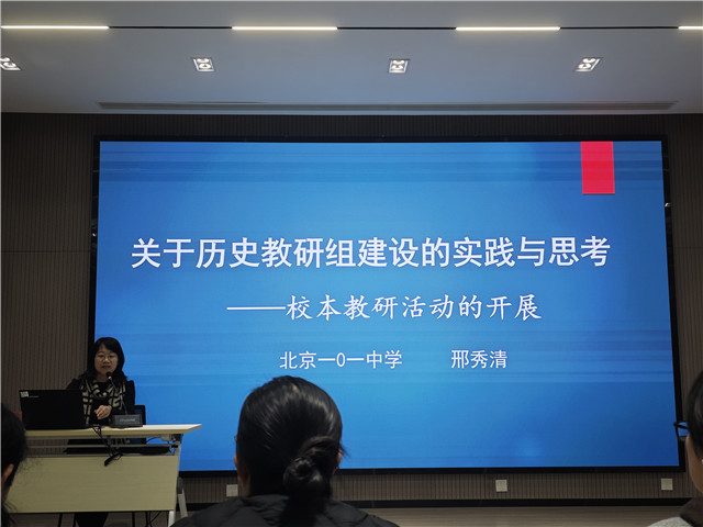 12月11日上午,中国教育学会教改实验部副主任、初中教育专业委员会副秘书长高淑英,以“课程育人”为核心主题开展专题报告,深入解读基础教育课程改革的政策方向与实践落地策略。报告开篇,高主任先回溯《关于全面深化课程改革落实立德树人根本任务的意见》(教育部2014年4号文),明确“核心素养”“课程育人”等改革关键词的政策起源,并梳理其“十项措施”的框架体系。随后,她聚焦《义务教育课程方案(2022年版)》,解析其育人目标的“三有”导向——培养“有理想、有本领、有担当”的时代新人,同时阐释方案在课程设置(如劳动课独立开设、艺术学科选修制)、实施管理(国家级监测、学校方案定制)等方面的新变化。下午,北京一零一中教师邢秀清围绕“历史教研组建设的实践与思考—校本教研活动的开展”主题开展专题分享,从课程体系构建、课堂教学研究、教师成长培育三个维度,系统阐述了校本教研活动的实施路径与实践成果。在基于课程体系构建的校本教研活动板块,邢老师首先点明课程体系构建的必要性,指出其是落实《普通高中课程方案》与《普通高中历史课程标准》要求、探索教育改革政策落地的关键路径,核心目标是培养学生历史学科核心素养。她提到,在实践层面,课程体系构建以“史实—史法—史观”为脉络,通过“国家课程校本化实施、强化校本特色课程、开发实践与活动课程”的策略打造历史学科课程群,形成了以《中外历史纲要》为基础、《国家制度与社会治理》为拓展、《史料研读》为深度挖掘,搭配《古墓探幽与博物奇想》等校本课程的多层次课程体系,实现了学生核心素养的滋养与教师专业能力的提升。