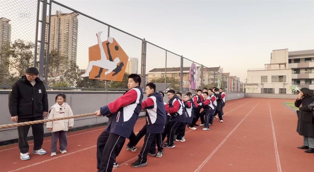 寒潮未减热情,冰雪更添豪情。田初中冬季趣味运动会圆满落幕。七(3)班“霜晨班”的学子们在拔河、跳长绳、足球趣味赛等项目中全力投入,将冬日的操场变成了锤炼意志、彰显团队的精神热土。 力拔山兮,凝“担当”之魄 拔河赛场,哨声即是命令。对阵双方势均力敌,红线在中间反复拉锯。“霜晨班”的队员们重心下压,紧握长绳,伴随着整齐划一、震耳欲聋的号子声,将全部力量拧成一股。那份面红耳赤却绝不松手的坚持,正是班级精神中“担当”与“笃志”最直接、最热血的外化。 绳舞飞扬,展“拓新”之谐 跳长绳区域,一片轻盈欢腾。长绳划破冷空气,发出清脆的“啪啪”声。同学们看准节奏,鱼贯而入,敏捷起落。从最初的磕绊到后来的行云流水,每一次成功的衔接都是对节奏、信任与默契的考验,生动演绎了“拓新”精神中勇于尝试、不断调整、追求卓越的内涵。 足下生趣,见“求真”之智 足球趣味赛场上,欢呼与笑声交织。运球绕杆、精准颠球、趣味射门……同学们在欢乐的竞技中不仅比拼技巧,更讲究策略与合作。如何以最有效的方式达成目标,这正是“求真”精神——讲求方法、尊重规则、务实协作在运动场上的延伸。 此次运动会,“霜晨班”在寒风中用汗水与欢笑证明:青春的活力可以融化严寒,集体的凝聚力能够温暖整个冬天。