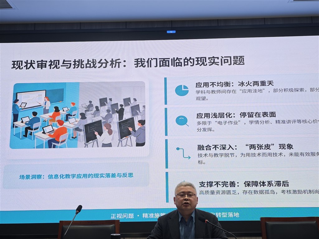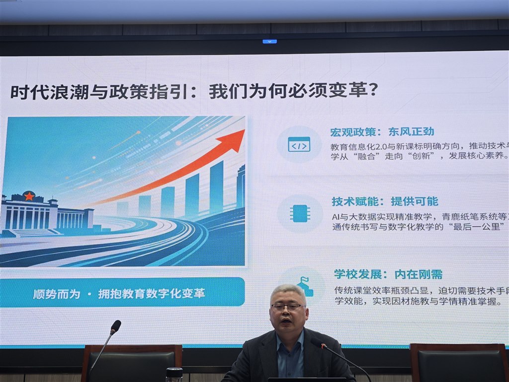 第二项内容是李军校长向全体教工作题为“数智赋能,重塑课堂——常州市田家炳初级中学课堂教学改革行动方案”专项教学改革工作的介绍与动员。我校将依托青鹿纸笔系统,启动全方位课堂教学改革行动,以数智赋能破解传统课堂效率瓶颈,实现精准教学与因材施教。本次改革立足“一果一世界,千果千芬芳”理念,以青鹿纸笔系统为核心载体,遵循课堂为本、循序渐进、学科适配、数据赋能四大原则,构建“课前精准诊断、课中即时互动、课后个性辅导”的新型教学模式。重点实施六大行动:教师能力提升行动通过阶梯式培训、青蓝工程等打造数智型教师队伍;学生学习优化行动引导学生主动运用数智工具,提升自主学习能力;资源建设完善行动构建校本资源库,打破数据孤岛;教研范式创新行动围绕精准讲评等主题深化教研;考核激励推进行动将应用纳入考核,激发改革动力。学校成立专项工作组,从组织、技术、经费等方面提供保障,力争实现教师、课堂、学生、资源、辐射、保障六大维度协同发展,全面提升教学质量与育人水平。